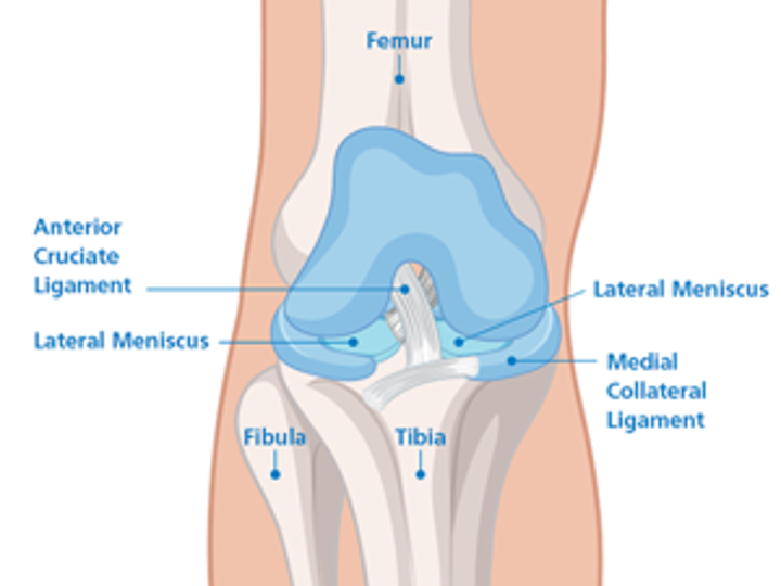 The ends of the bones are covered with a layer of cartilage that absorbs shock and allows the bones to glide easily against one another as they move. Between the tibia and femur bone are two crescent-shaped pads of cartilage that reduce friction and disperse the weight of the body across the joint called the meniscus. The bones are held together by a joint capsule, four key ligaments and two key groups of muscles; your quadriceps and hamstrings.