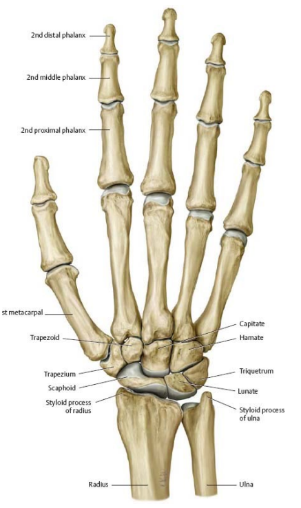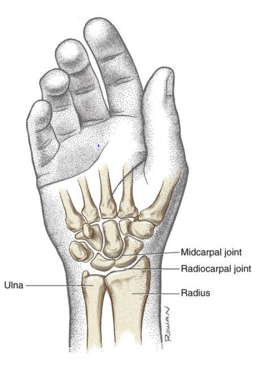 The wrist joint is made up of two bones from your forearm, the ulnar and radius. These connect to a group of small bones in the hand called the carpal bones.